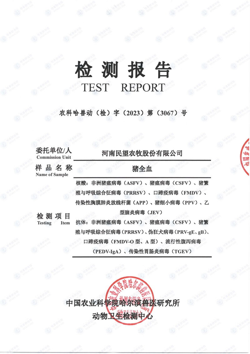 為確保各位合作伙伴引種安全,民望農牧不僅堅持自檢,還接受國家及省市各級動物疫病控制中心的監(jiān)督和檢測,同時與哈爾濱獸醫(yī)研究所合作,對民望5A高端原種進行更嚴格的檢測,確保種豬及引種的各項指標健康和安全,為合作伙伴把關生物安全,將風險降到零,是我們民望人追求的安全生產目標。