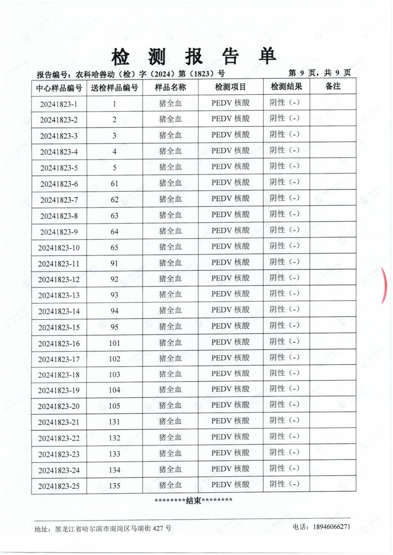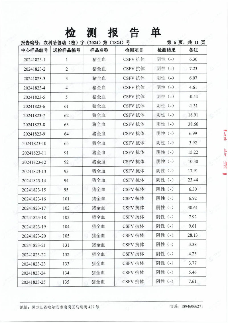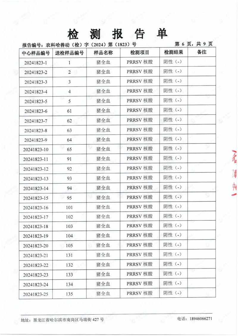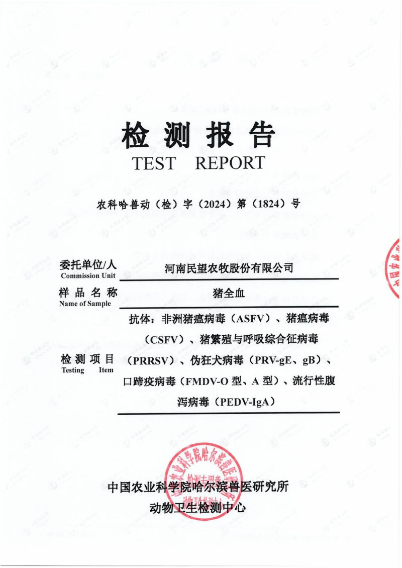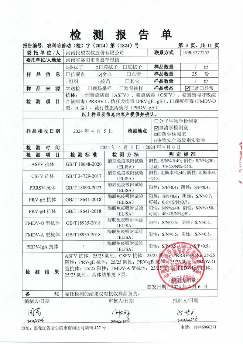民望農(nóng)牧2024年4月份送哈獸研檢測6項疫病雙陰