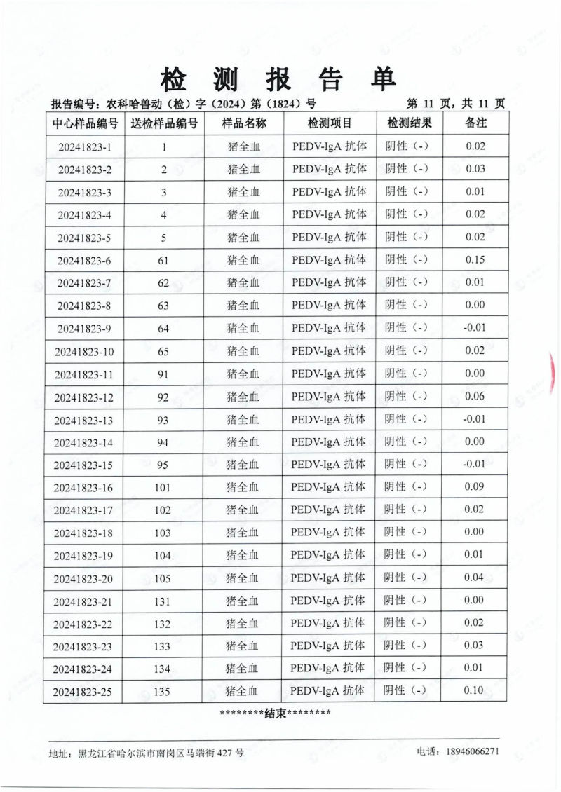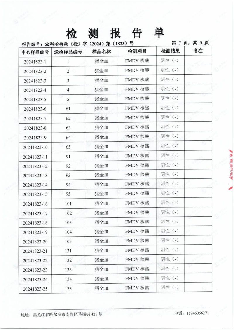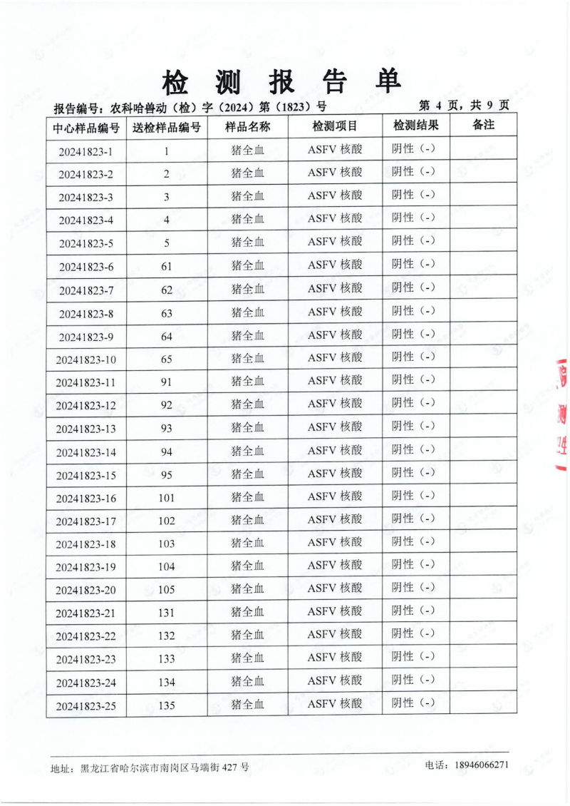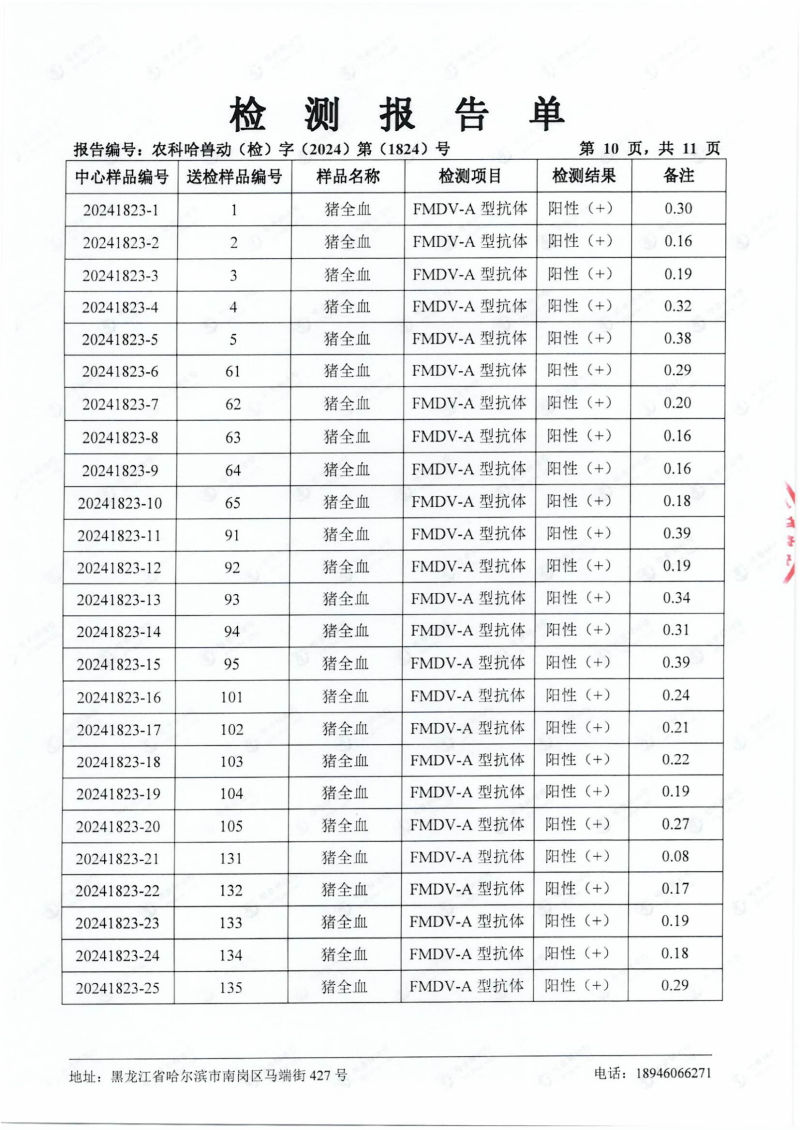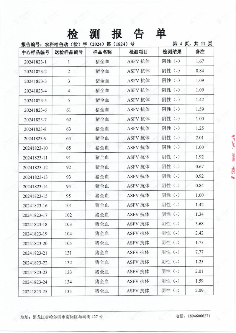 民望農(nóng)牧2024年4月份送哈獸研檢測6項疫病雙陰