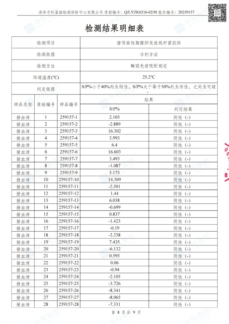抗體:豬傳染性胸膜肺炎放線桿菌抗體、豬瘟病毒抗體、豬繁殖與呼吸綜合征病毒抗體、豬偽狂犬病病毒gB抗體、豬偽狂犬病病毒gE抗體、豬流行性腹瀉病毒抗體(IgA)、非洲豬瘟病毒抗體