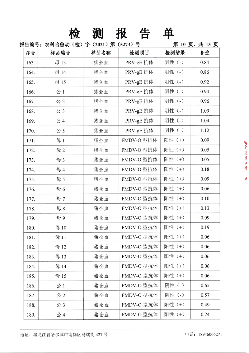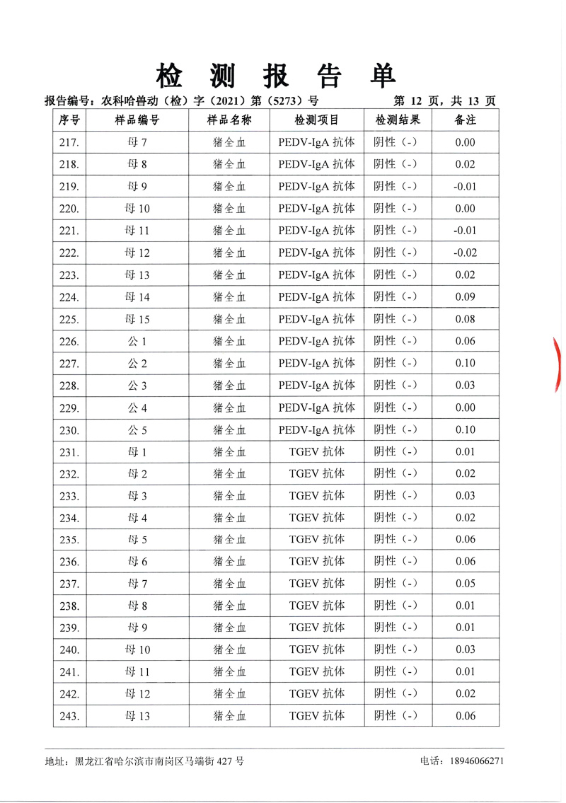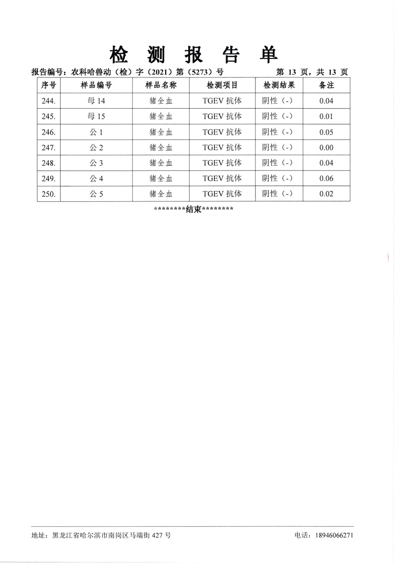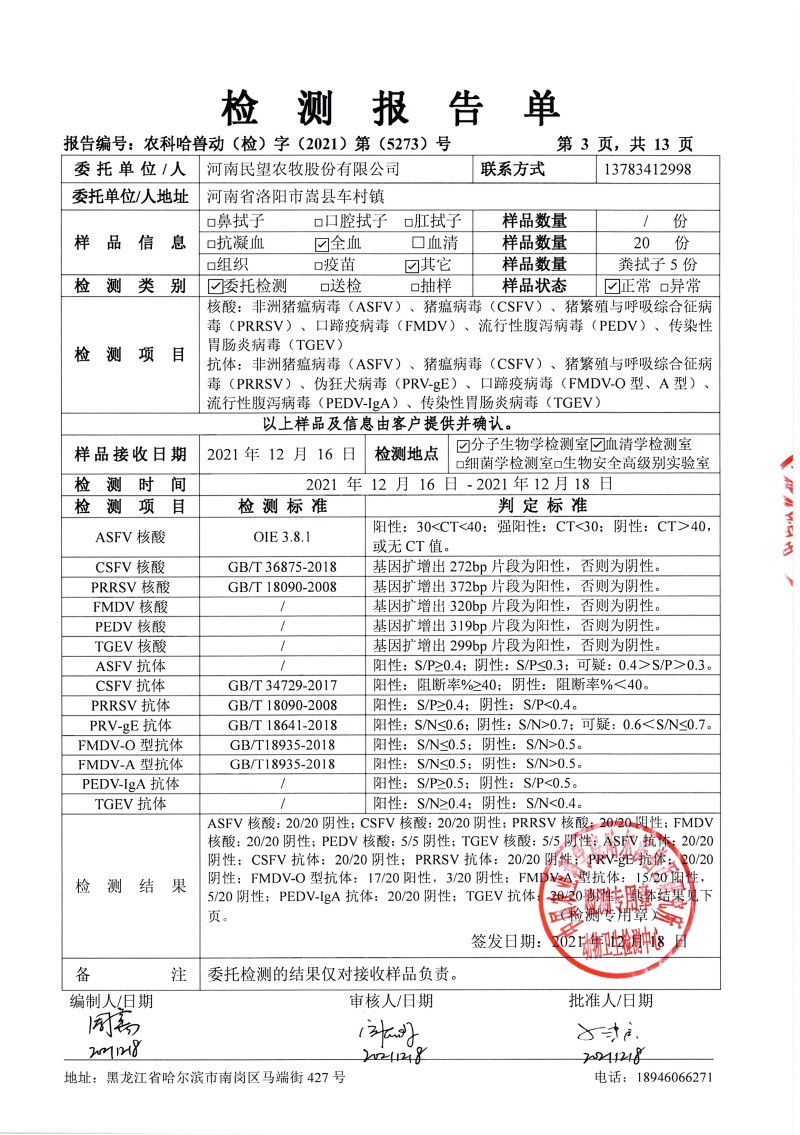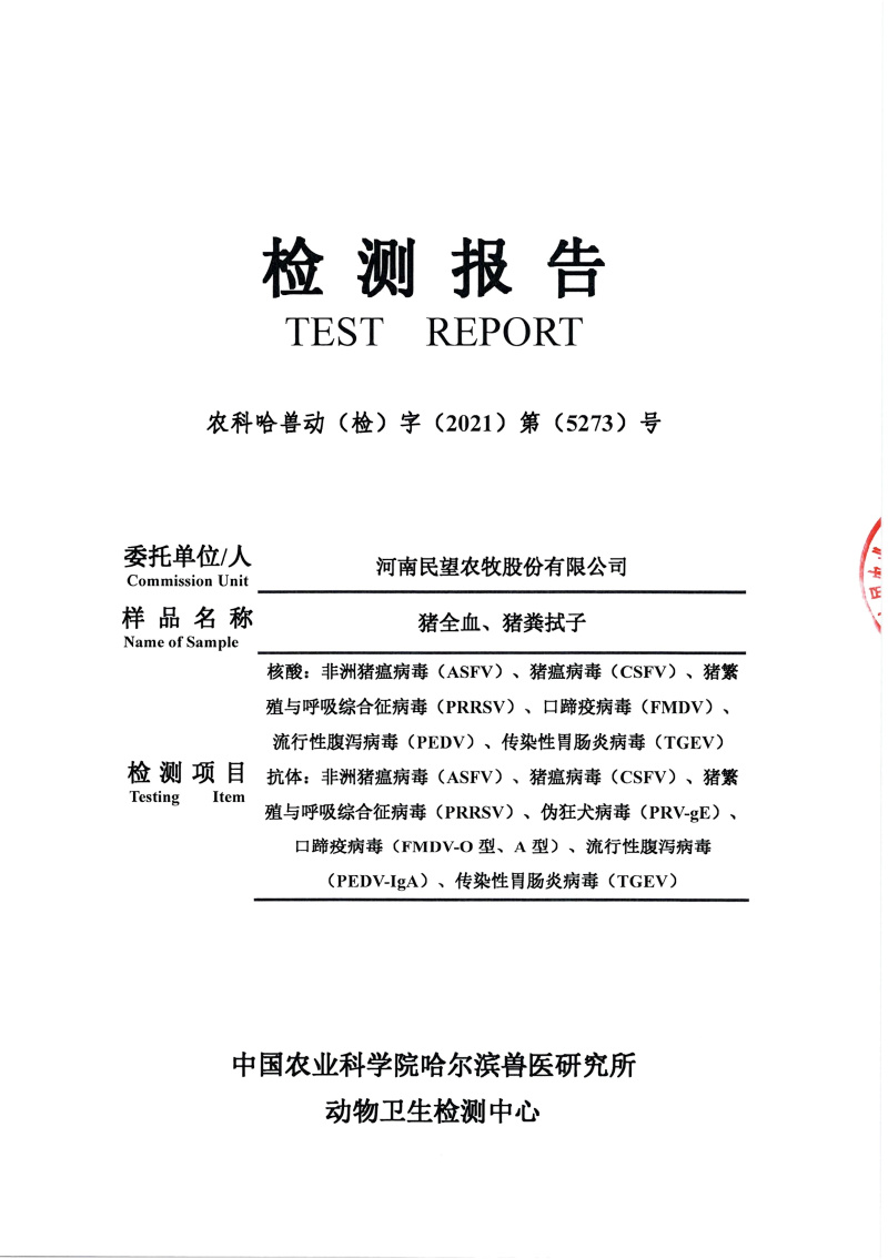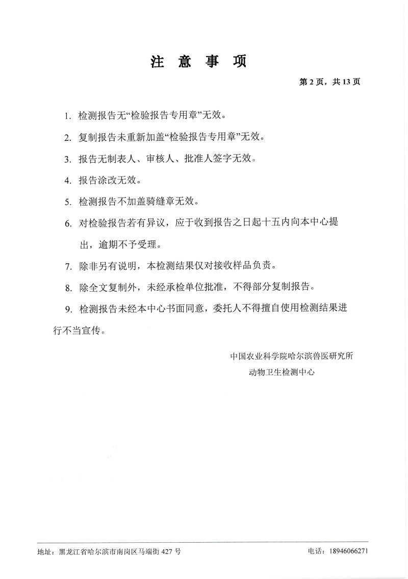 民望農(nóng)牧2021年12月份中國農(nóng)業(yè)科學院哈爾濱獸醫(yī)研究所檢測報告