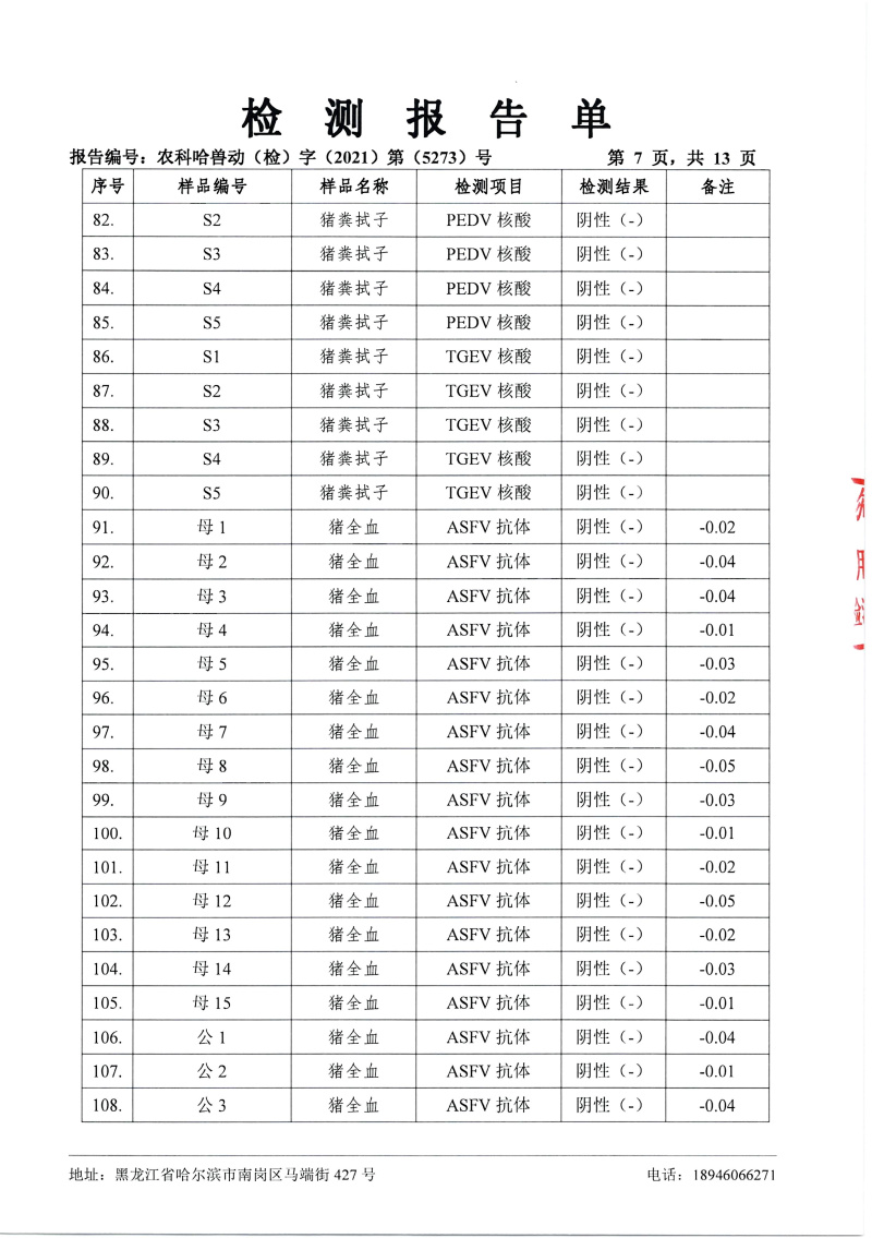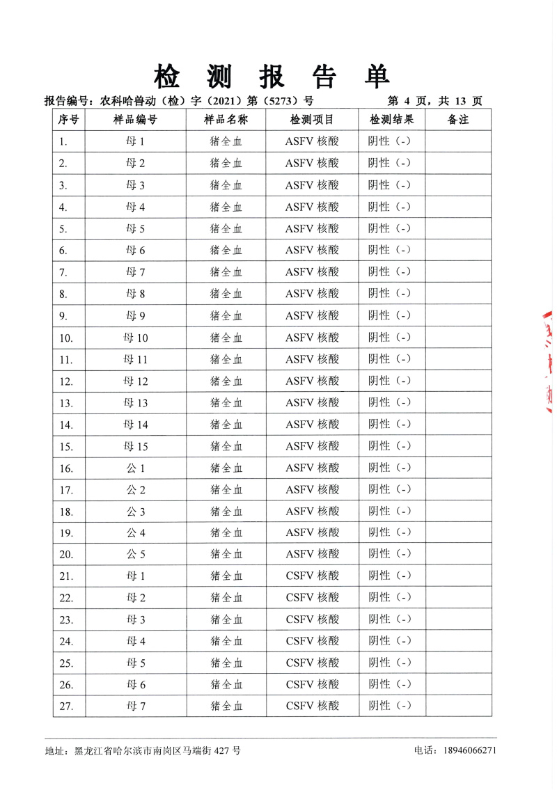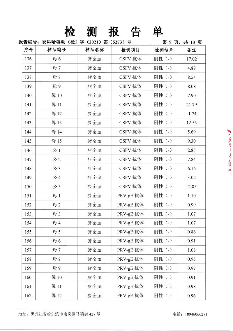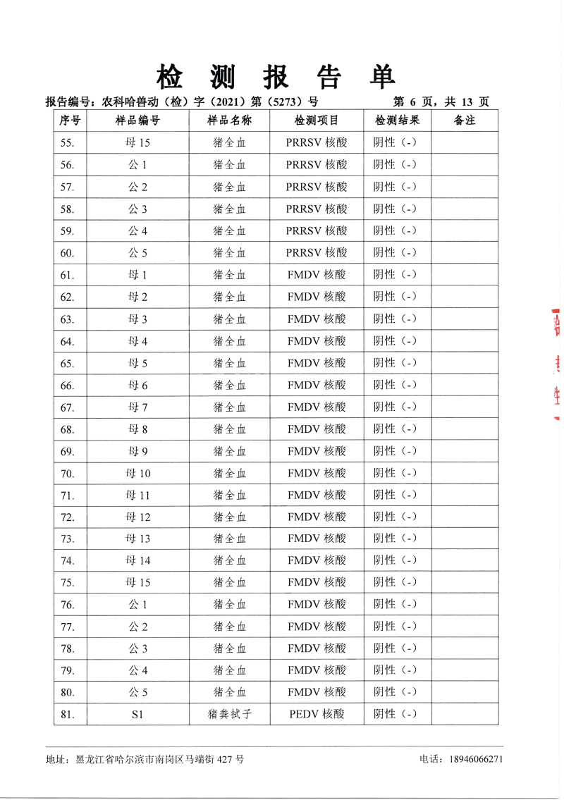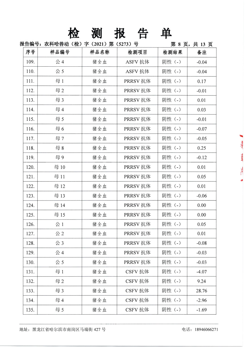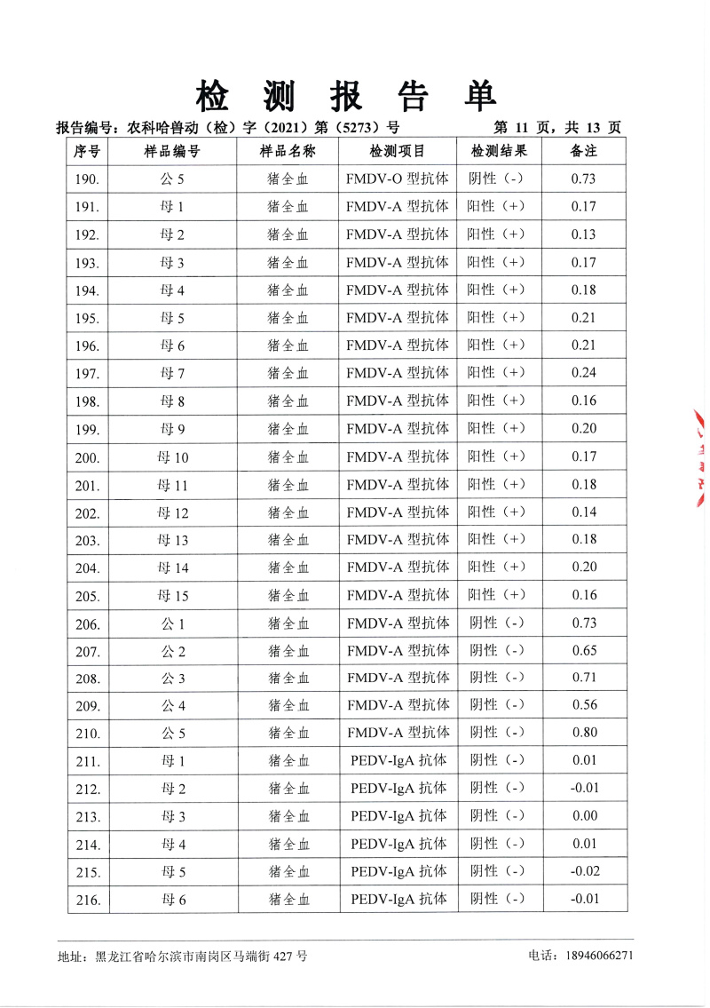 民望農(nóng)牧2021年12月份中國農(nóng)業(yè)科學院哈爾濱獸醫(yī)研究所檢測報告